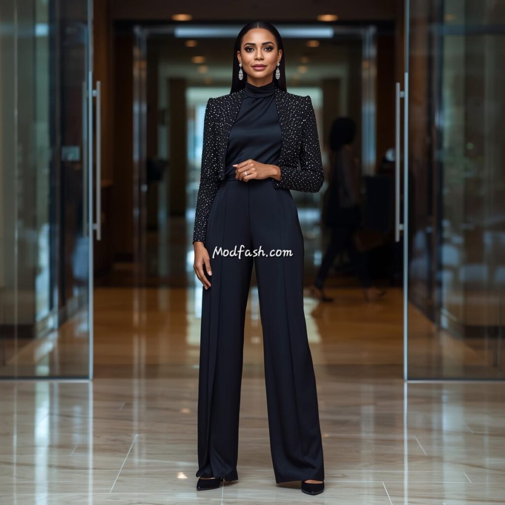 11. Black Wide-Leg Trousers with Embellished Jacket