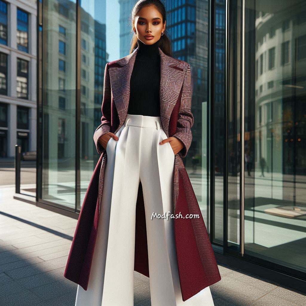 This layered outfit blends tradition with contemporary style. A long plaid coat over a black turtleneck and white trousers creates warmth and modest coverage. The high neckline and tailored layers offer warmth and sophistication, making it a alternative choice for Christmas service.