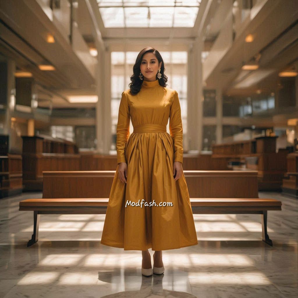 Elegant and modest, this full-skirted mustard-yellow ankle-length dress features a high neckline and long sleeves—an echo of the hope and radiance Christ brings to the world. Paired with white heels and statement earrings, it’s a beautiful choice—especially when Christmas Day isn’t too chilly.
