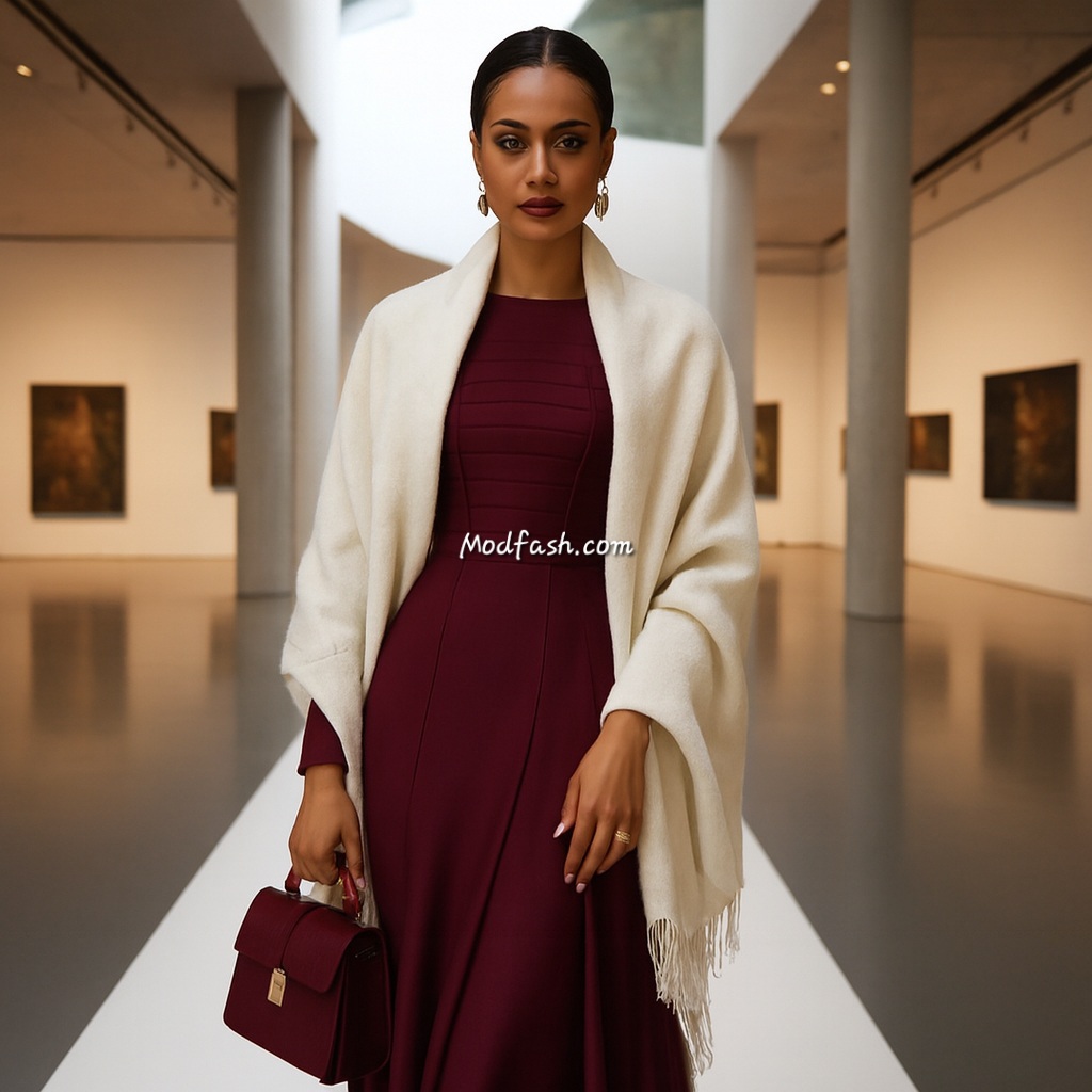 Designed in rich burgundy, this dress features artful horizontal pleats and a flared skirt. Softened by a white shawl and gold accessories, its warm color and graceful silhouette makes it a great choice for Christmas service.