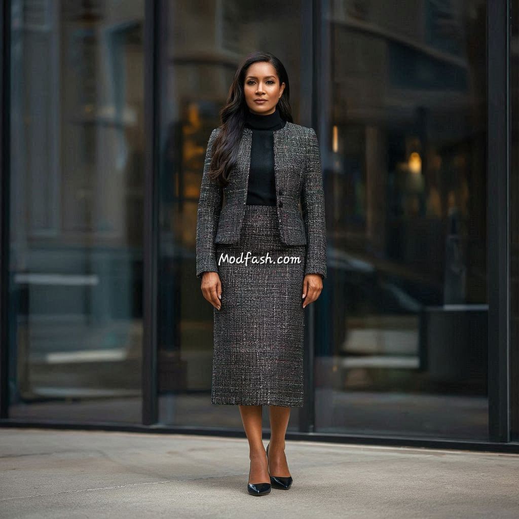 Classic and dignified, this tweed skirt suit offers structure and modesty through its knee-length skirt and tailored jacket. Paired with a black turtleneck, it reflects timeless respect for the sacred space of worship.