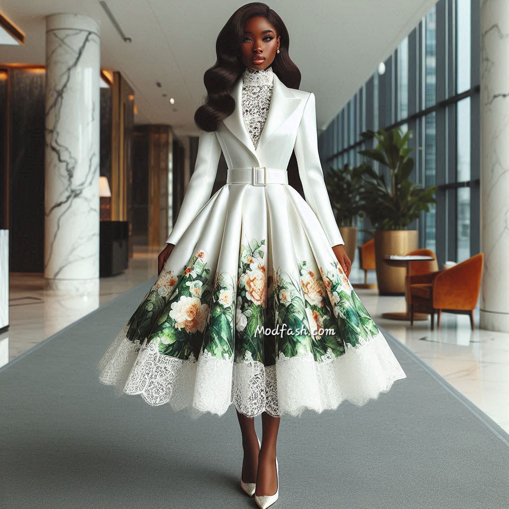 This double-breasted white coat dress, adorned with bold black polka dots, offers a joyful yet respectful expression of Christmas celebration. Falling well below the knees and layered over a black high-neck top, the look is refined and modest. Red heels add festive cheer—an elegant reminder that modesty can be both reverent and classy.