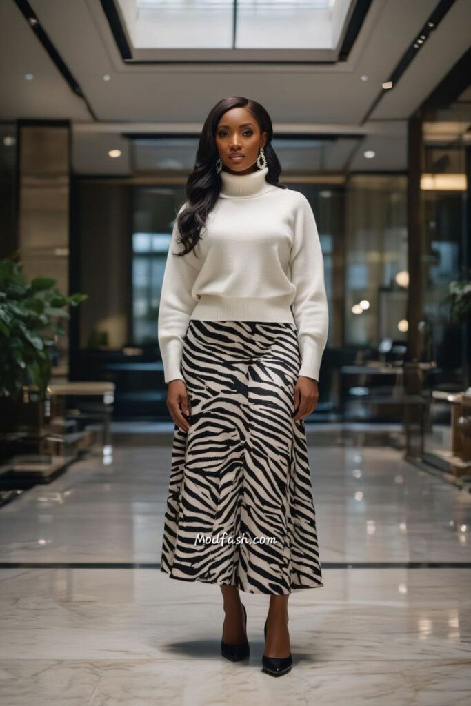 A crisp white turtleneck paired with a flowing zebra-print skirt creates a look that is polished without excess. The high neckline and long sleeves provide thoughtful coverage, while the pattern adds quiet interest—demonstrating balance between simplicity and creativity.