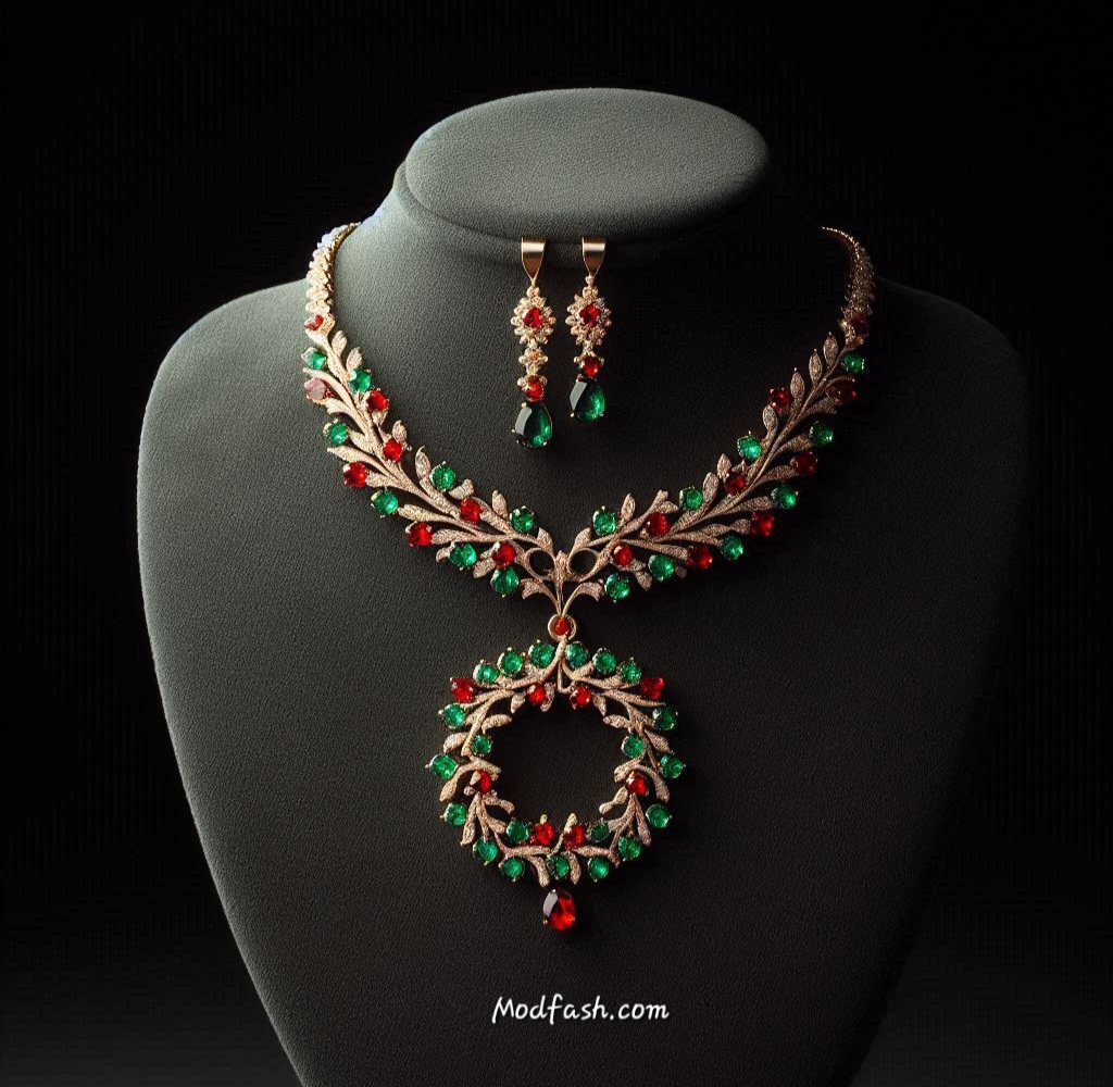 This wreath-inspired set, designed with red and green gemstones, naturally complements classic Christmas colors. It pairs best with simple dresses, allowing the jewelry to enhance the outfit’s festive character while keeping the overall look balanced.