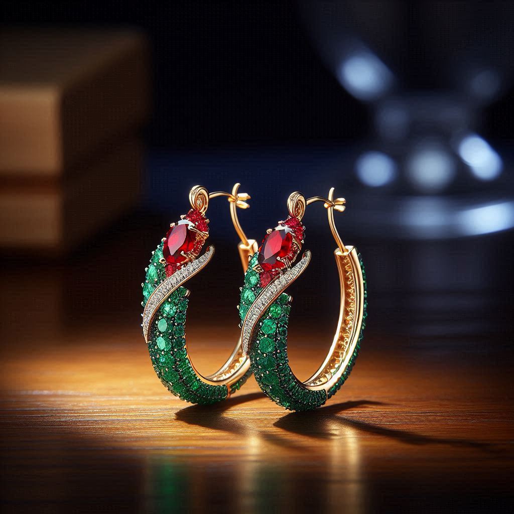These hoop earrings, featuring green and red gemstones, pair beautifully with simple Christmas dresses. Their color combination enhances festive outfits while keeping the silhouette clean.